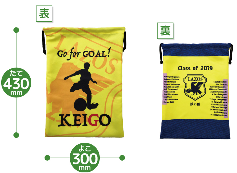 ユニフォームと同じデザインのバッグに、1人ずつのお名前や番号なども差し替えられる!